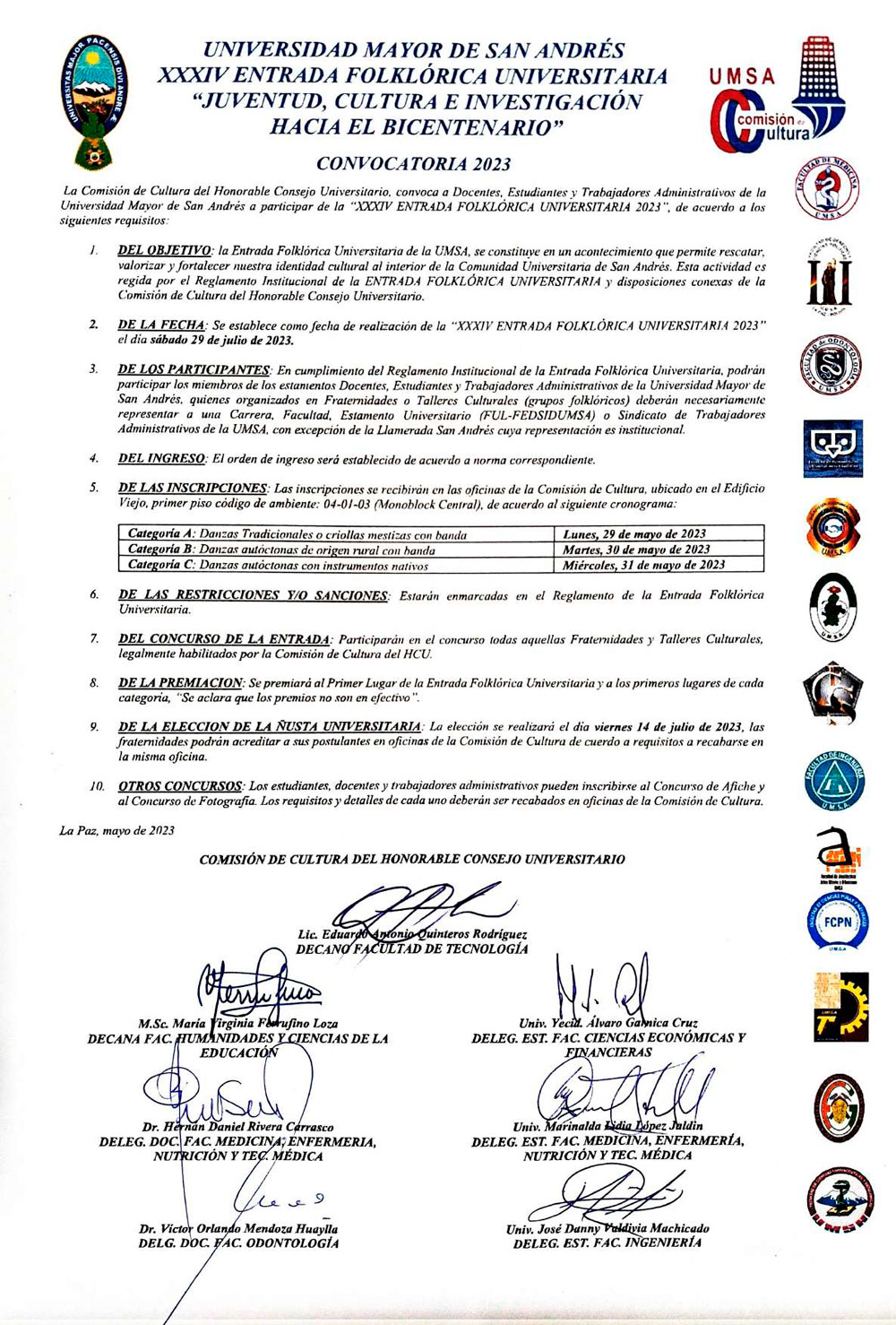 CONVOCATORIA 2023 XXXIV ENTRADA FOLKLÓRICA UNIVERSITARIA “JUVENTUD, CULTURA E INVESTIGACIÓN HACIA EL BICENTENARIO”